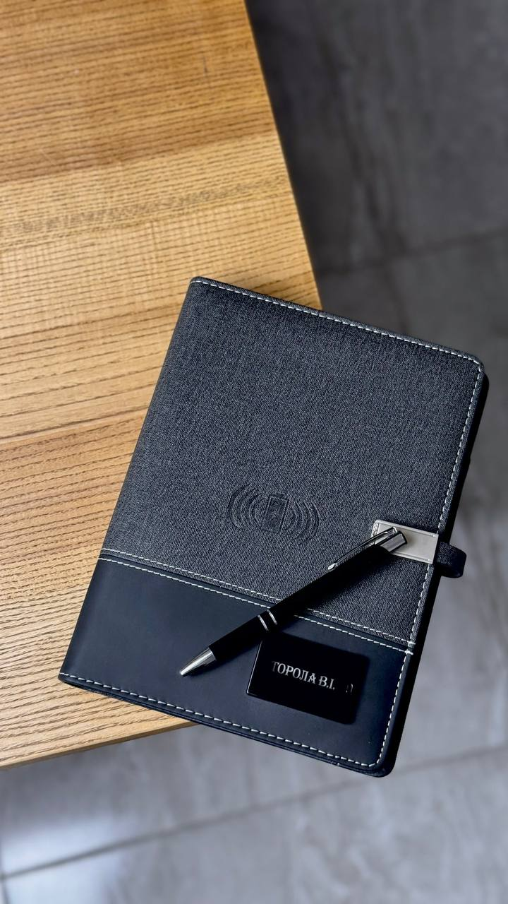 Ежедневник с гладкой экокожей и тканью дополнен встроенным Powerbank, флешкой и беспроводной зарядкой — всё для того, чтобы оставаться на связи даже в движении.